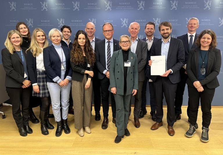 The Minister of Trade and Industry Jan Christian Vestre receiving the report on 4 December in Oslo. Ørjan Nilsen, partner at Simonsen Vogt Wiig, participated in the report as a lawyer with specific expertise in corporate law, and was present at the handover (second from the right).