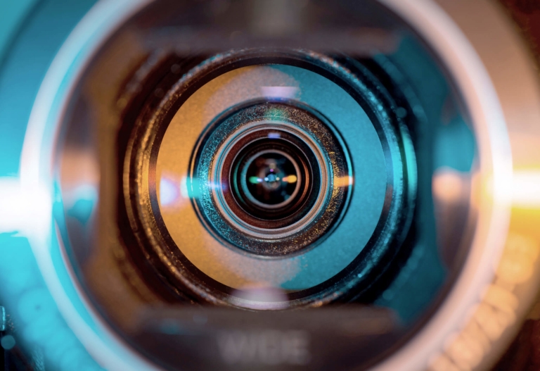 Video camera lens lit in blue and orange