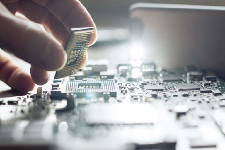 Technician plug in CPU microprocessor to motherboard socket. Workshop background