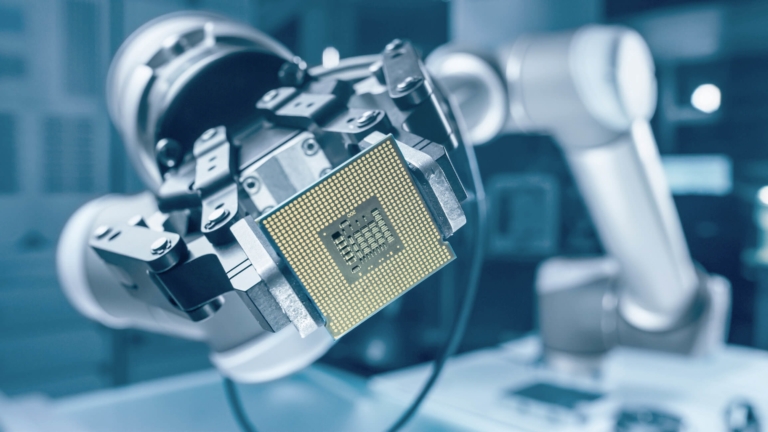 Modern High Tech Authentic Robot Arm Holding Contemporary Super Computer Processor. Industrial Robotic Manipulator End Effector Holding CPU Chip